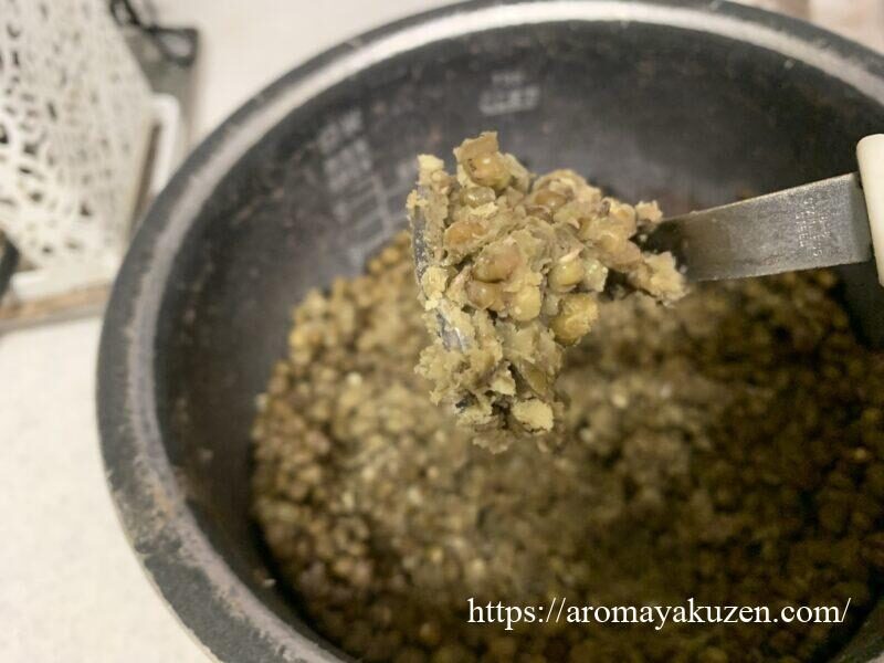 一晩水に漬けて玄米モードで炊きあがった緑豆です。水を含んでいるので1粒が、かなり大きくなりました。